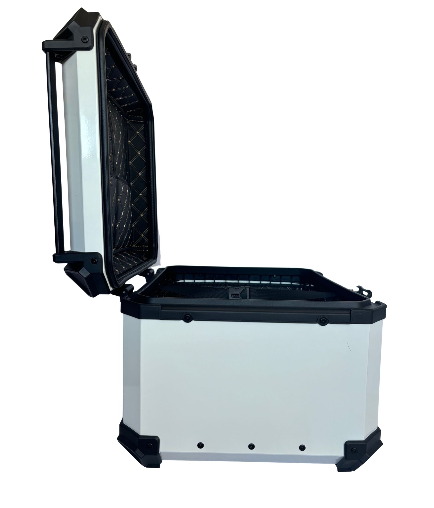 Baúl de Moto GGM 55L Blanco – Aluminio Reforzado, Impermeable, Antirrobos, Acolchado Interior de Lujo