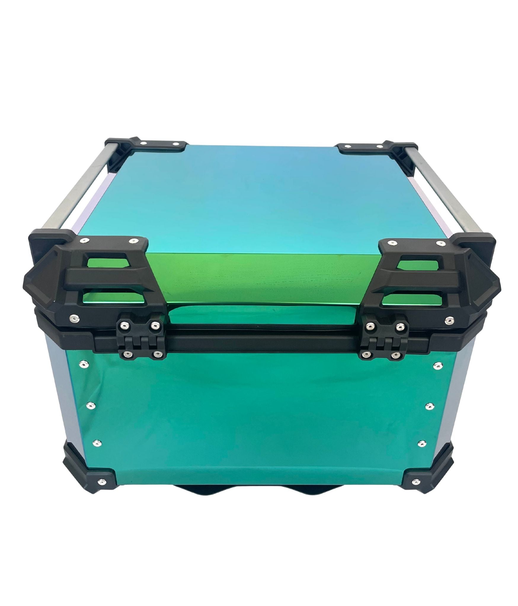 Baúl de aluminio premium que protege tu equipaje con cerradura de seguridad. Perfecto para uso diario o aventuras largas en carretera.